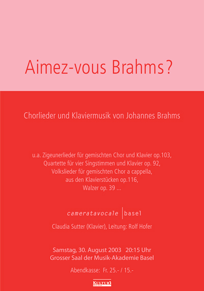 Die CVB hat im Jahre 2003 weltliche Chorwerke von Johannes Brahms aufgeführt.