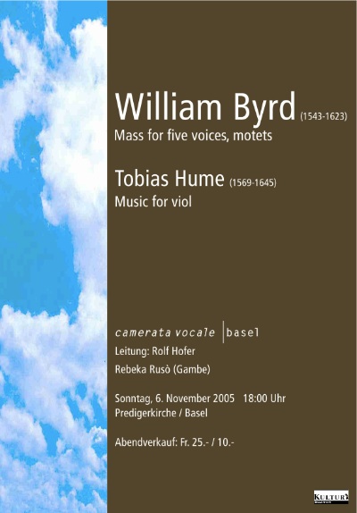 In den 20 Jahren ihres Bestehens hat sich die Camerata Vokale Basel mehrmals englischer Chormusik gewidmet: 1999 Messe für vier Stimmen und Motetten von William Byrd; 2000 Motetten von Byrd; 2002 Dixit Dominus von G.F.Händel; 2005 fünfstimmige Messe von Byrd.
