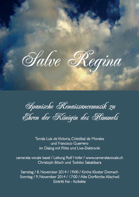 Im Zentrum dieses Projektes stehen geistliche Chorwerke aus der Hochblüte der der Spanischen Renaissance. Um de Victorias klangvolle 8-stimmige Missa Salve Regina gruppieren sich 4- bis 8-stimmige Marien-Motetten von de Victoria (1548-1611) Cristobal Morales (1500-1553) und Francisco Guerrero (1527-1599). Alle drei Komponisten gehören zu den ganz grossen Meistern der spanischen Renaissance-Musik. Morales, der älteste der drei war in Sevilla Lehrer von Guerrero. Mit de Victoria, der in Rom als Leiter der Kapelle des Collegium Germanicums der Nachfolger von keinem Geringeren als Palestrina an war, verbindet ihn, dass auch er viele Jahre in Rom wirkte, bevor er wieder nach Spanien zurückkehrte. Guerrero hingegen lebte hauptsächlich in Spanien und kam nur zweimal auf seinen Reisen nach Rom. Bei der Auswahl der Stücke haben wir darauf geachtet, möglichst das ganze Ausdrucksspektrum dieser Musik zum Erklingen zu bringen. Einchörige Sätze werden mit ausladenden doppelchörigen Stücken kontrastieren, homophone mit streng kontrapunktisch gearbeiteter Musik, meditative Motetten mit Stücken grösster klanglicher Prachtentfaltung. Kontrastiert werden die Chorwerke durch zeitgenössische instrumentale Interludien. Scelsis Duo Ko-Loh für Flöte sowie die Uraufführung einer Komposition für Flöte und Live-Elektronik von Christoph Bösch, welche auf die Vokalwerke Bezug nimmt, werden das Programm stilistisch um neue Dimensionen auffächern und bereichern.