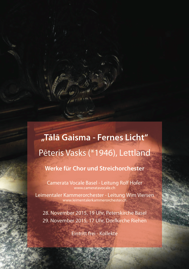 Die Camerata Vocale Basel und das Leimentaler Kammerorchester widmen ihr gemeinsames Adventskonzert ganz der Musik des lettischen Komponisten Pēteris Vasks. Im Zentrum steht die Messe für Chor und Streichorchester von 1990, umrahmt wird sie vom «Pater Noster», einem Ausschnitt aus dem Violinkonzert «Tālā Gaisma – Fernes Licht», das Vasks für Gidon Kremer komponierte, sowie – passend zur Jahreszeit – von zwei Sätzen des vierteiligen Werks «Musica Adventus». Pēteris Vasks ist ein Komponist, der niemanden kalt lässt. Oft wird der 1946 im lettischen Aizpute geborene Musiker in einem Atemzug genannt mit den Komponisten aus dem Umfeld des ehemaligen Ostblocks, wie Arvo Pärt, Henryk Gorécki, Veljo Tormis oder Giya Kancheli, die neue Modelle des tonalen Komponierens gefunden haben und mit ihrer spirituell aufgeladenen Einfachheit einen Sehnsuchtsnerv westlicher Musikhörer getroffen haben. Die Spannung in Vasks’ Musik wird vor allem aus dem Widerstreit zweier unvereinbarer Welten bezogen: auf der einen Seite introvertiert-einfache, naiv-volksnahe Diatonik mit schlichten Melodien und Harmonien; und auf der anderen Seite wilde, eruptive Ausbrüche, in welcher die Einzelstimmen haltlos durcheinanderirren: Die Konfrontation des Menschlichen und der Natur mit dem Unmenschlichen und Gewalttätigen. Der Sohn eines Pfarrers versteht seine Musik als spirituell, humanistisch, ethisch und moralisch fundierte Bekenntnisse: «Mit reinen und leidenschaftlichen Klängen bemühe ich mich, die Schönheit der von Gott geschaffenen Welt zu bezeugen. Mein Wunsch war es immer, mit meiner Musik die Welt ein wenig besser und glücklicher zu machen.»