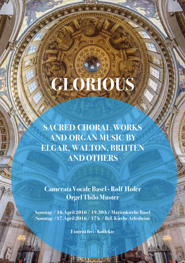 Am 16.4.2016 (Marienkirche Basel 19.30 Uhr) und 17.4.2016 (Ref. Kirche Arlesheim, 17.00) bringen wir mit dem Organisten Thilo Muster zusammen Englische Chor- und Orgelmusik von Elgar, Britten, Walton, William Faulkes u.a. zu Gehör: Gotteslob in überkonfessioneller Freude und Dankbarkeit dem Schöpfer und der Maria gegenüber, wie das viele unserer Konzerte in der Vergangenheit erfolgreich versucht haben.